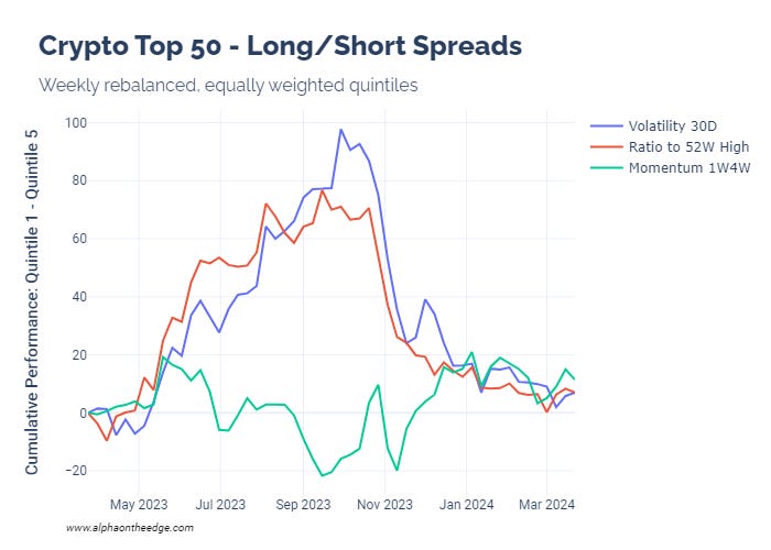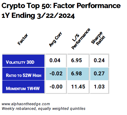 Additionally, our original volatility factor has the correlation with the highest absolute value, suggesting that it has the strongest relationship to returns among the three factors. This doesn’t mean that we should all go invest in volatile coins. Rather, it means that this is a factor that we could watch through time and, if the strength of the relationship holds, look at more deeply.