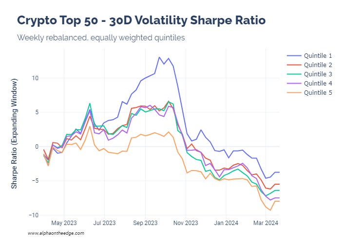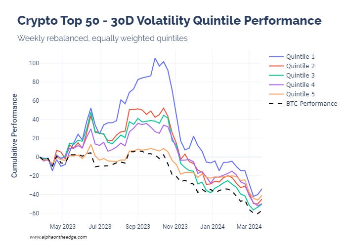 Say we re-measure 30 day volatility each week and buy the 10 coins in each quintile with equal weighting. Here’s how the portfolios would have performed: