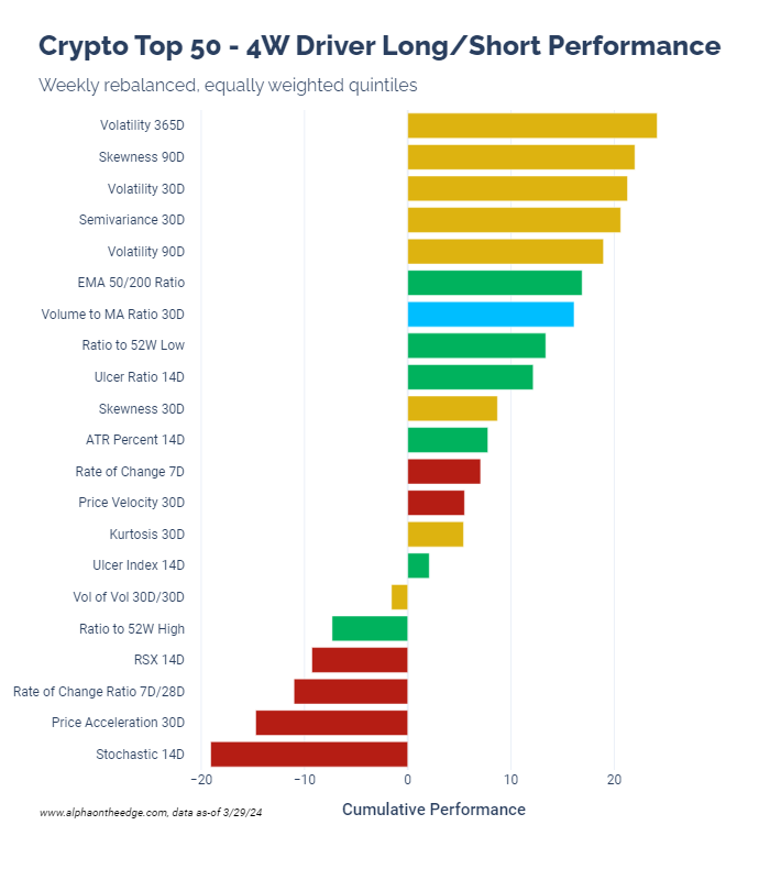 The other fascinating part of driver analysis is the diversification potential. Volatility is understandably correlated with volatility, but not with all strategies. And some momentum strategies, for example, have very low correlation with all categories of drivers. This tells us that volatile coins tended to not have momentum in the past year.